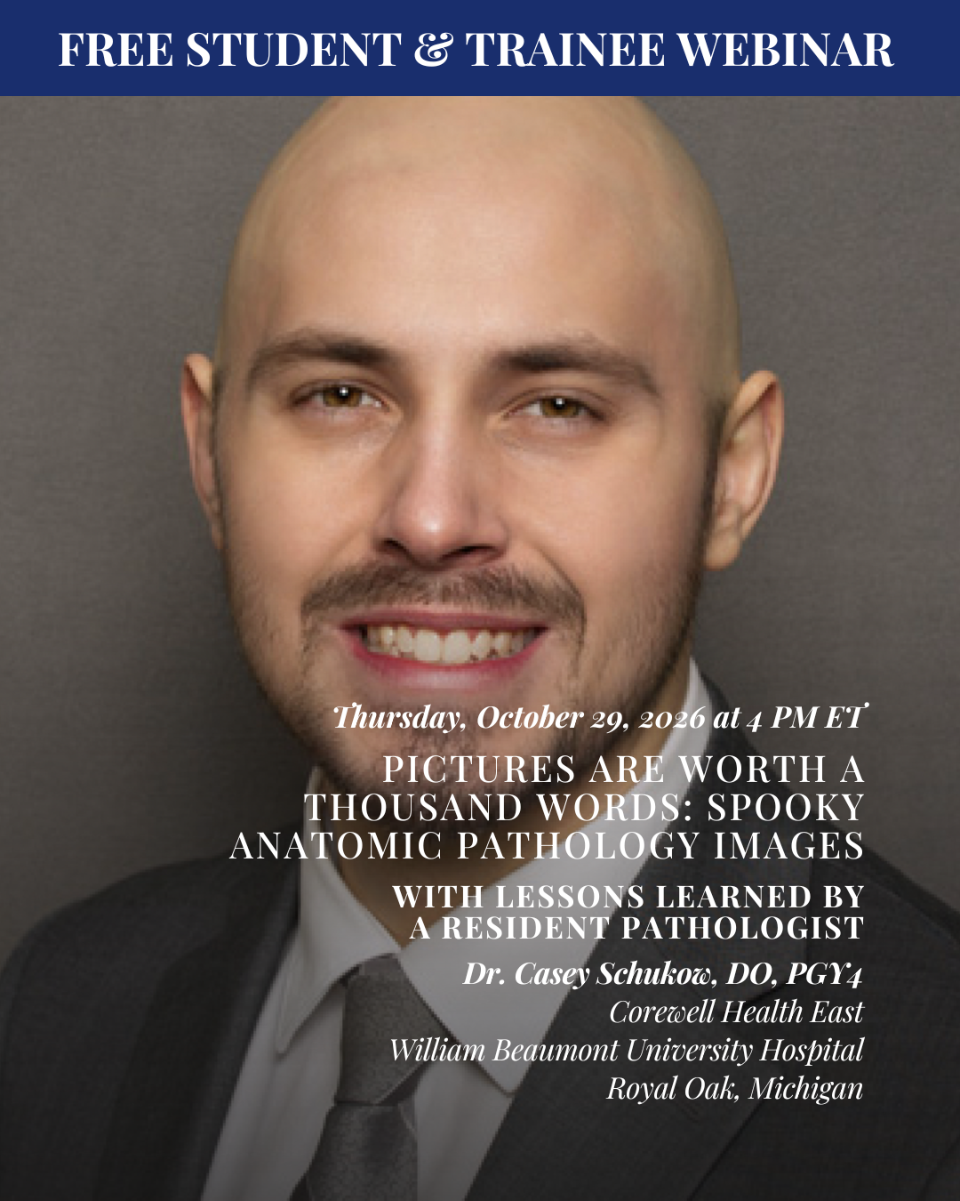 "Pictures are worth a thousand words: Spooky anatomic pathology images with lessons learned by a resident pathologist" Link to register for event: https://us06web.zoom.us/webinar/register/WN_jWu_DcvRRJynhVIfG3cswg