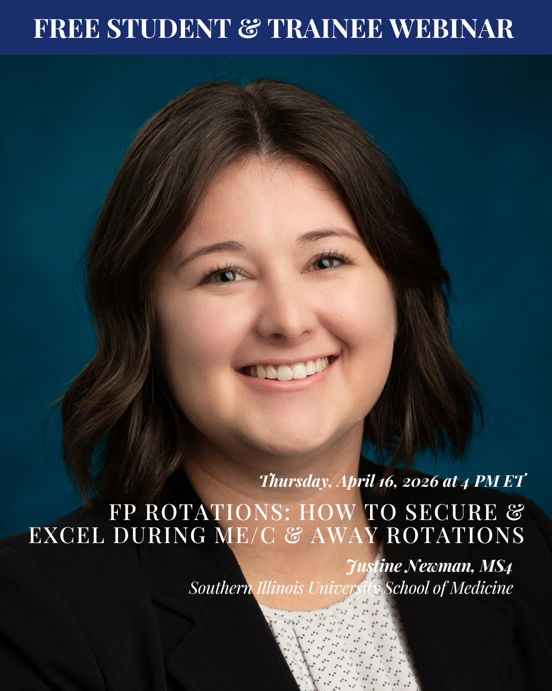 "FP Rotations: How to Secure and Excel during ME/C & Away Rotations Panel" Link to register for event: https://us06web.zoom.us/webinar/register/WN_3UMfhOgtRaieNssEJqLAMA