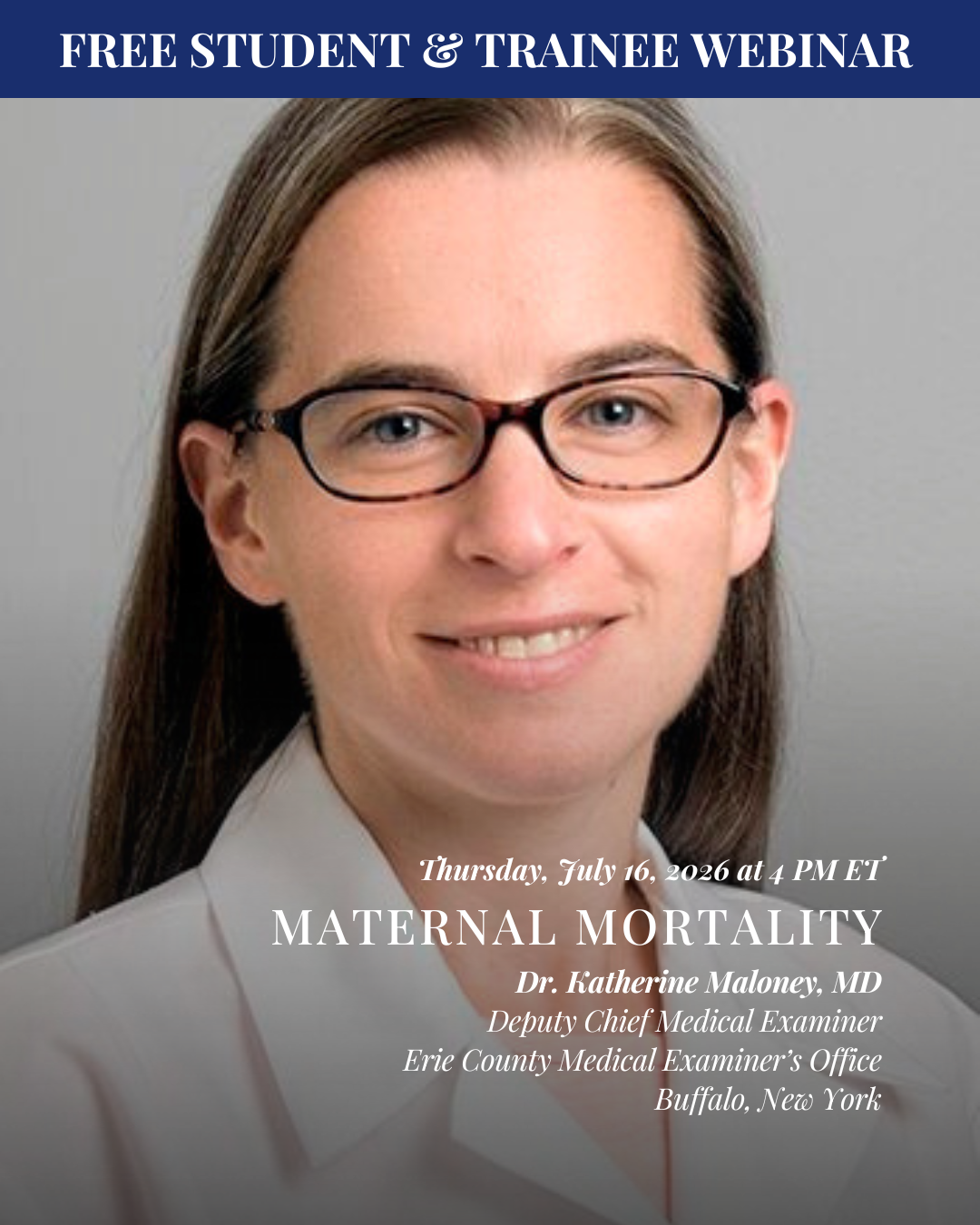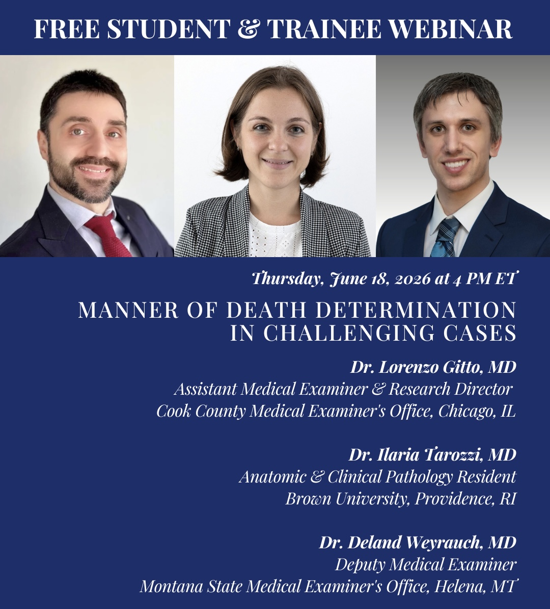 "Manner of Death Determination in Challenging Cases" Link to register for event: https://us06web.zoom.us/webinar/register/WN_b9i1ileURg-l9scRmV47QQ